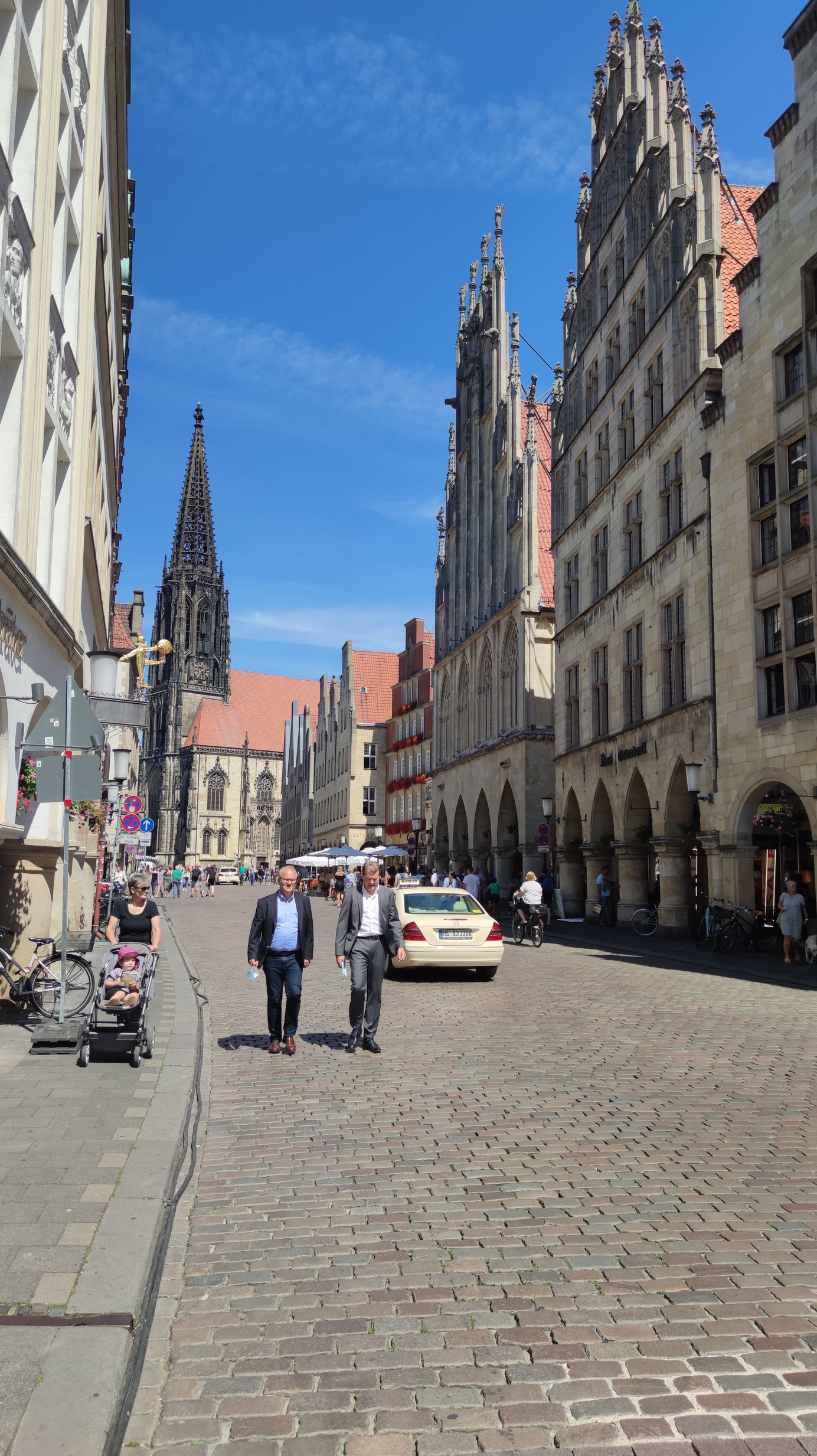 In Münster was het plan om de stad te bekijken, mobiel opladen en wifi zoeken om foto’s te kunnen uploaden. Münster is op zich een niet heel indrukwekkend stad. De echte bezienswaardigheden zijn de kerk en een mooie oude straat. De rest is voornamelijk nieuwbouw, waarvan een paar mooie architectuur hebben. Het was vandaag erg warm en ik heb daardoor een beetje lang door de stad geslenterd. Ik wilde nog redelijk dicht bij Osnabrück uitkomen, dus ik heb bijna de hele avond flink doorgefietst.