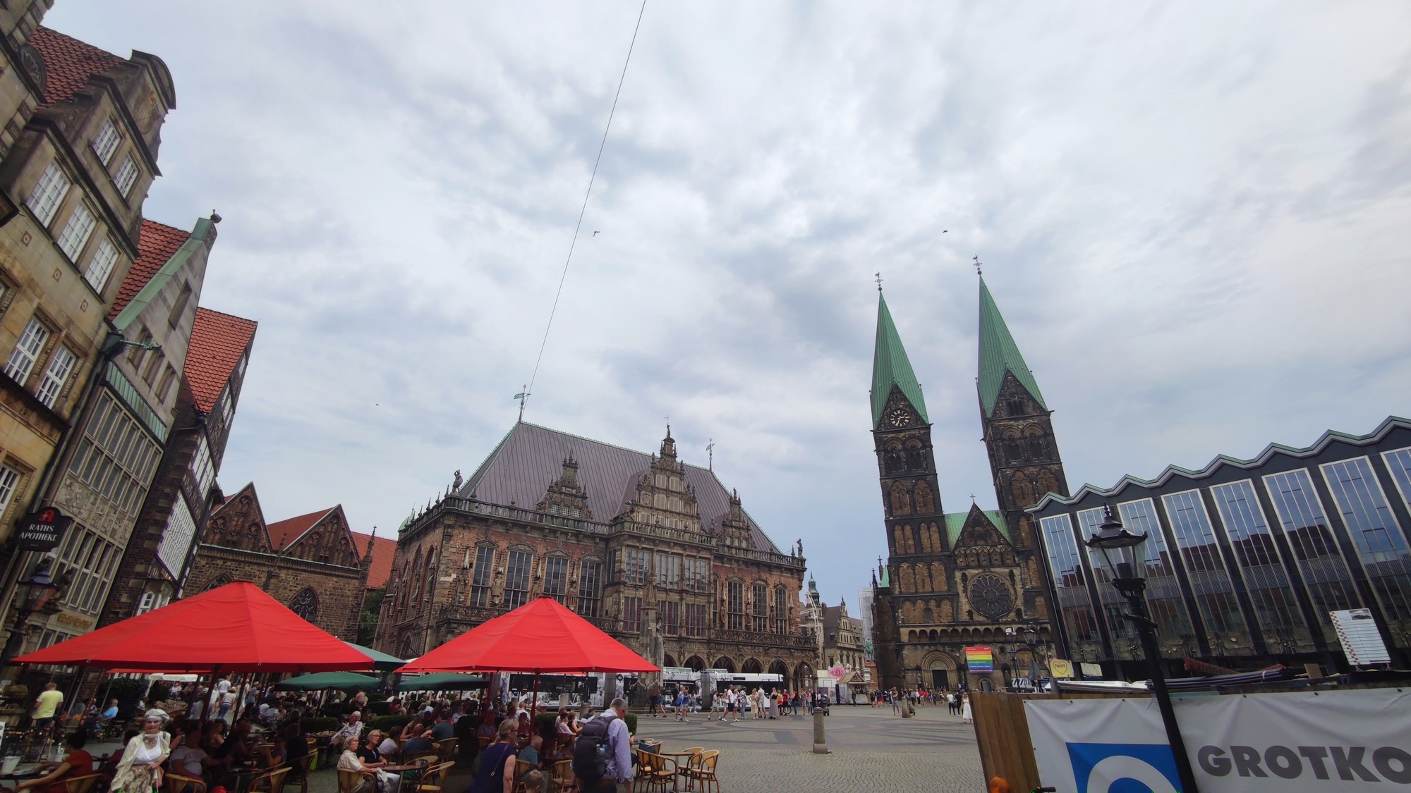 Bremen was druk. Het was erg mooi weer een veel mensen waren op straat. Er was een klein marktje waar ik wat gegeten heb. Ook had ik wat frozen yogurt geprobeerd. Het is wel oké. Ook lag er een Nederlands pannenkoeken schip in de rivier. Na nog een beetje rondkijken in Bremen ben ik doorgefietst.